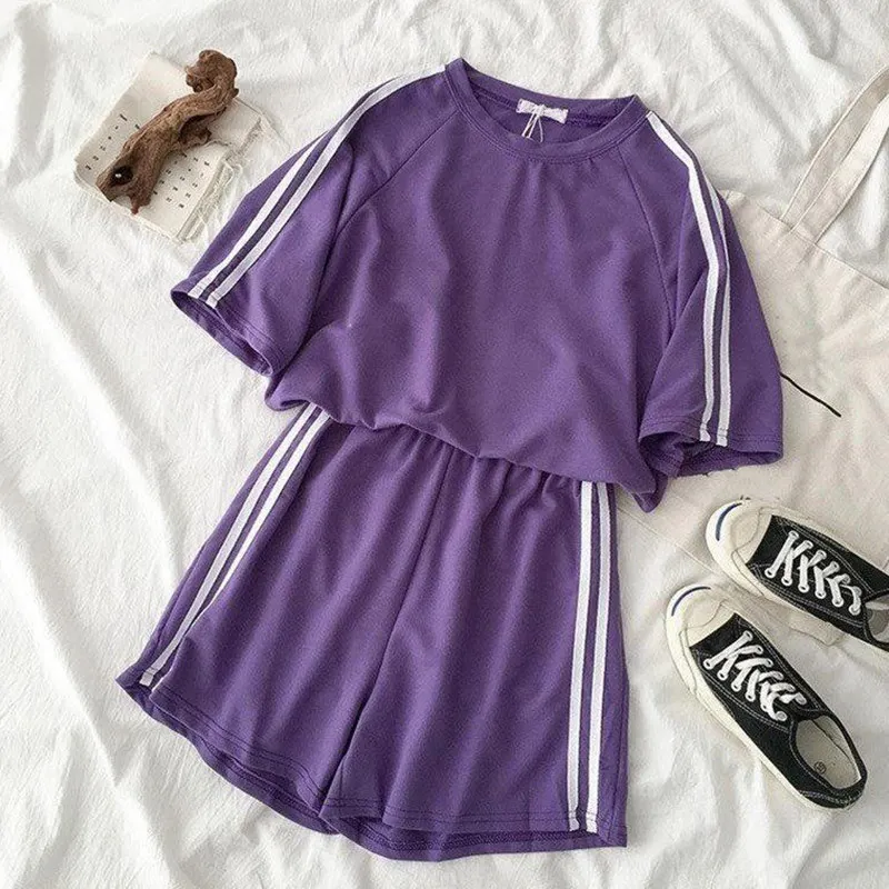 Summer Striped Tracksuit Set For Women Short Sleeve T Shirt Mini Shorts Two Piece Set Female 2021 Casual Women’s Sportwear Suit