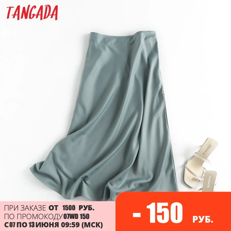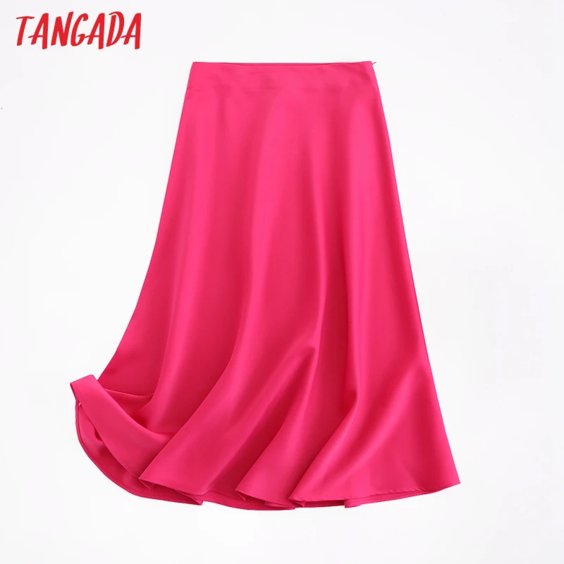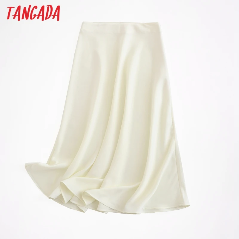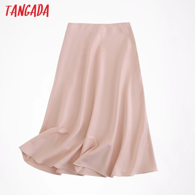 Tangada women solid quality satin midi skirt vintage side zipper office ladies elegant chic A-line skirts 6D18
