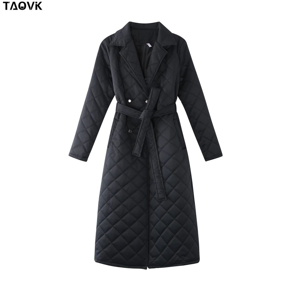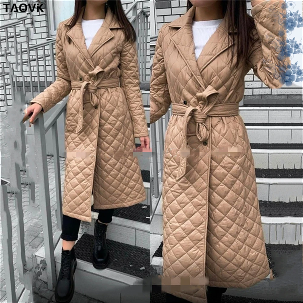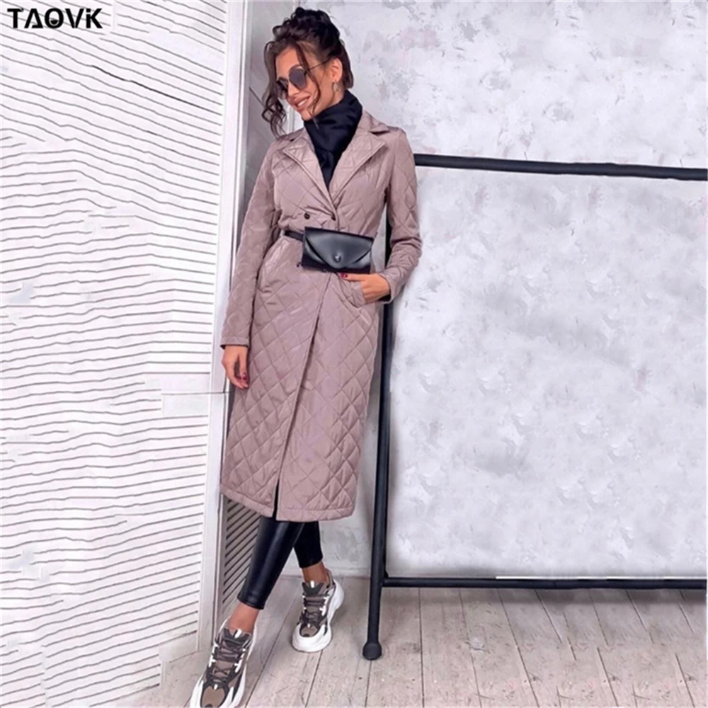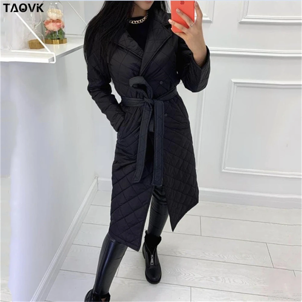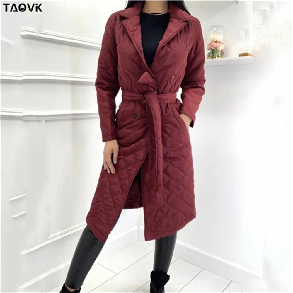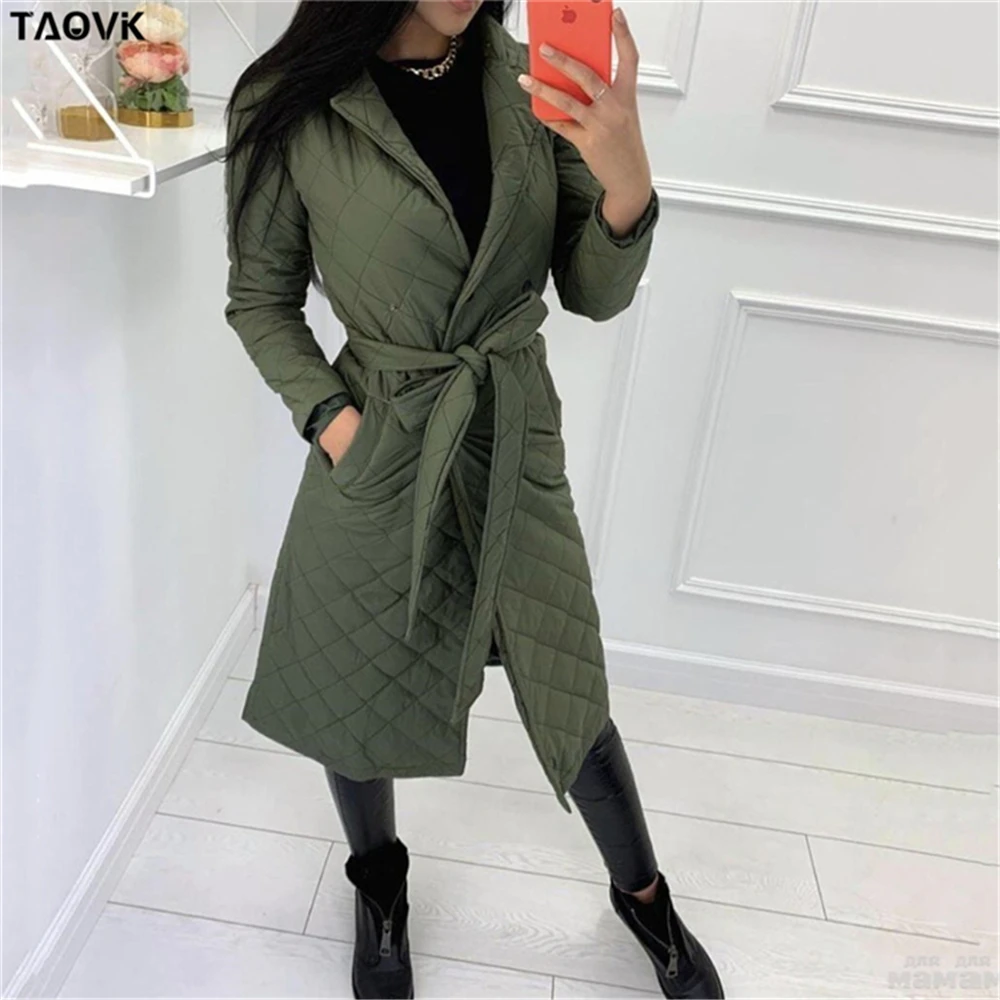 TAOVK Long straight winter coat with rhombus pattern Casual sashes women parkas Deep pockets tailored collar stylish outerwear