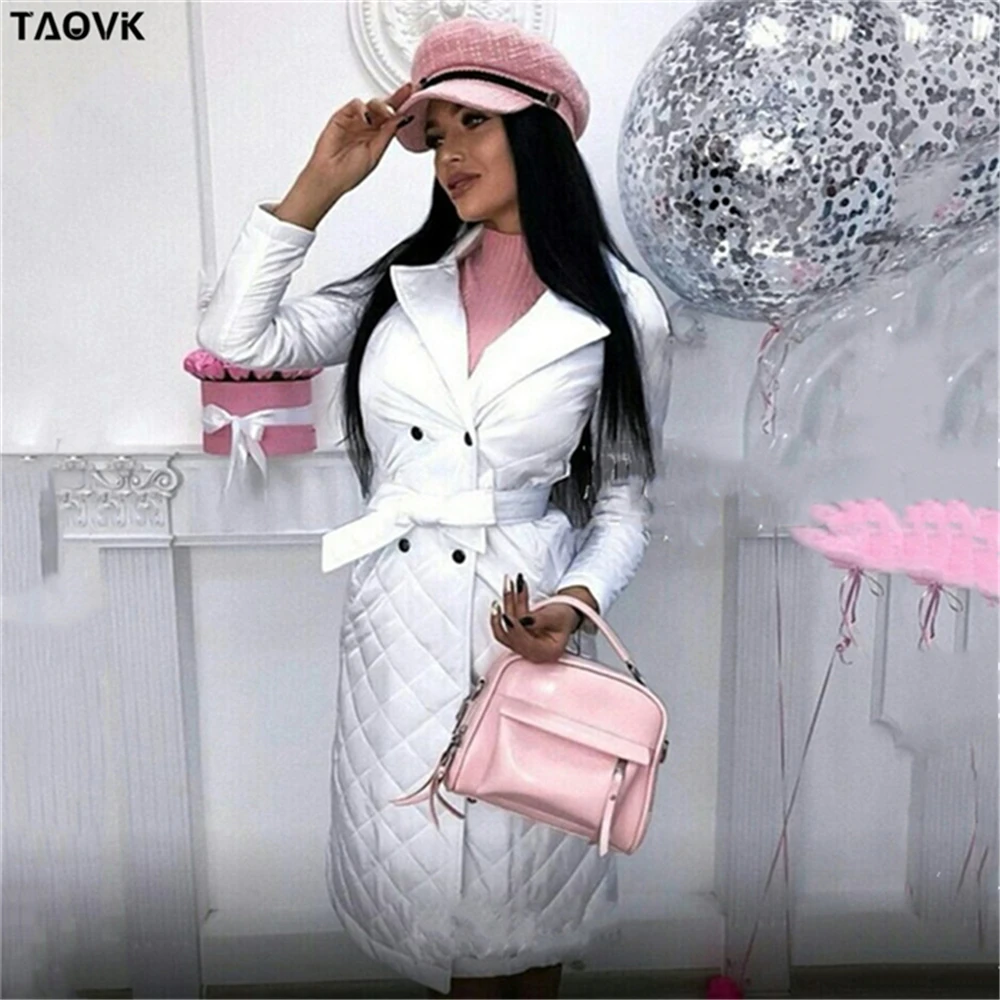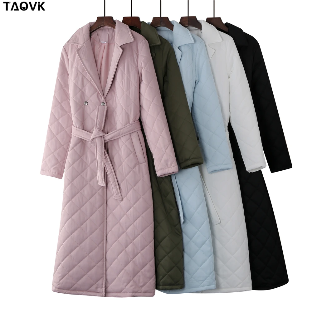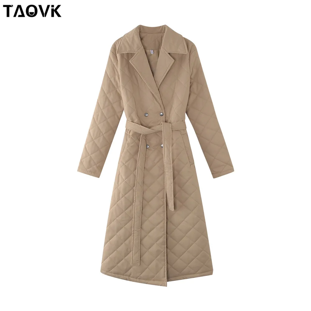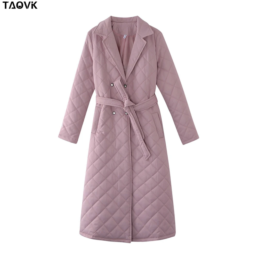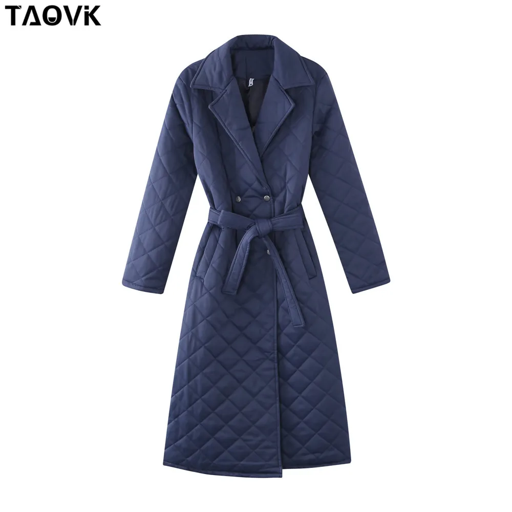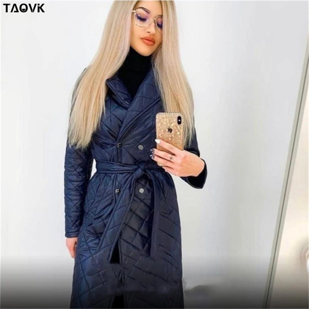 TAOVK Long straight winter coat with rhombus pattern Casual sashes women parkas Deep pockets tailored collar stylish outerwear