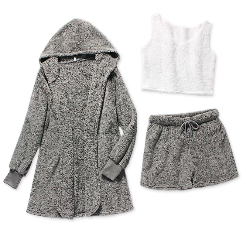 Three Piece Sexy Fluffy Outfits Plush Velvet Hooded Cardigan Coat+Shorts+Crop Top Women Tracksuit Sets Casual Sports Sweatshirt