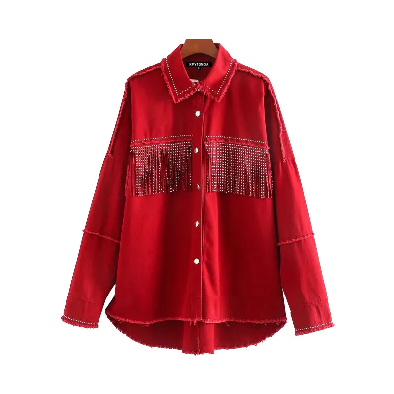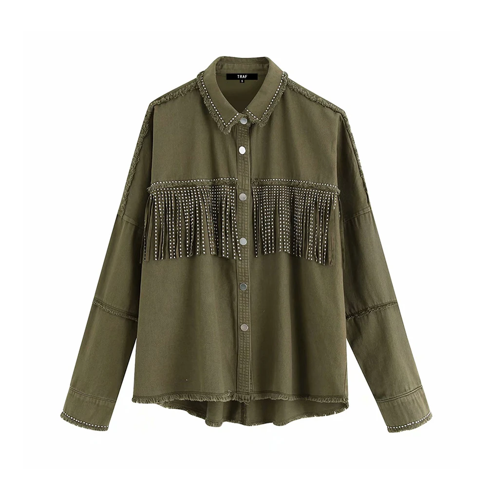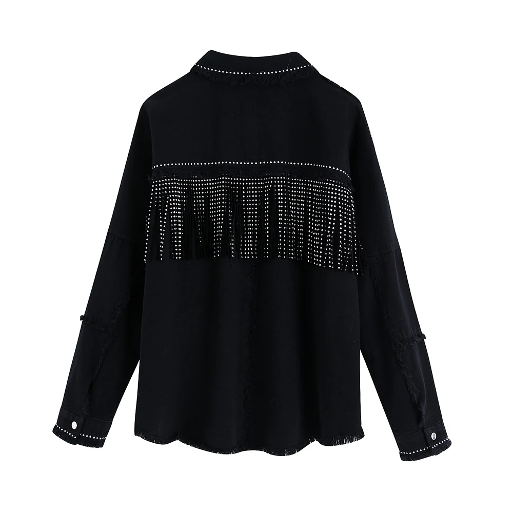TRAF Women Stylish Tassel Beaded Oversized Denim Jacket Coat Vintage Fashion Long Sleeve Frayed Trim Outerwear Chic Loose Tops