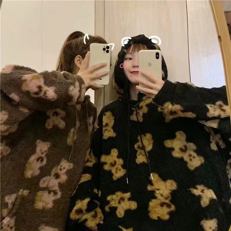 V-hanver little bear Pattern furry Hoodie 2020 Winter Warm Plush sweet Pullovers Woman Vintage korean Style loose Sweatshirt