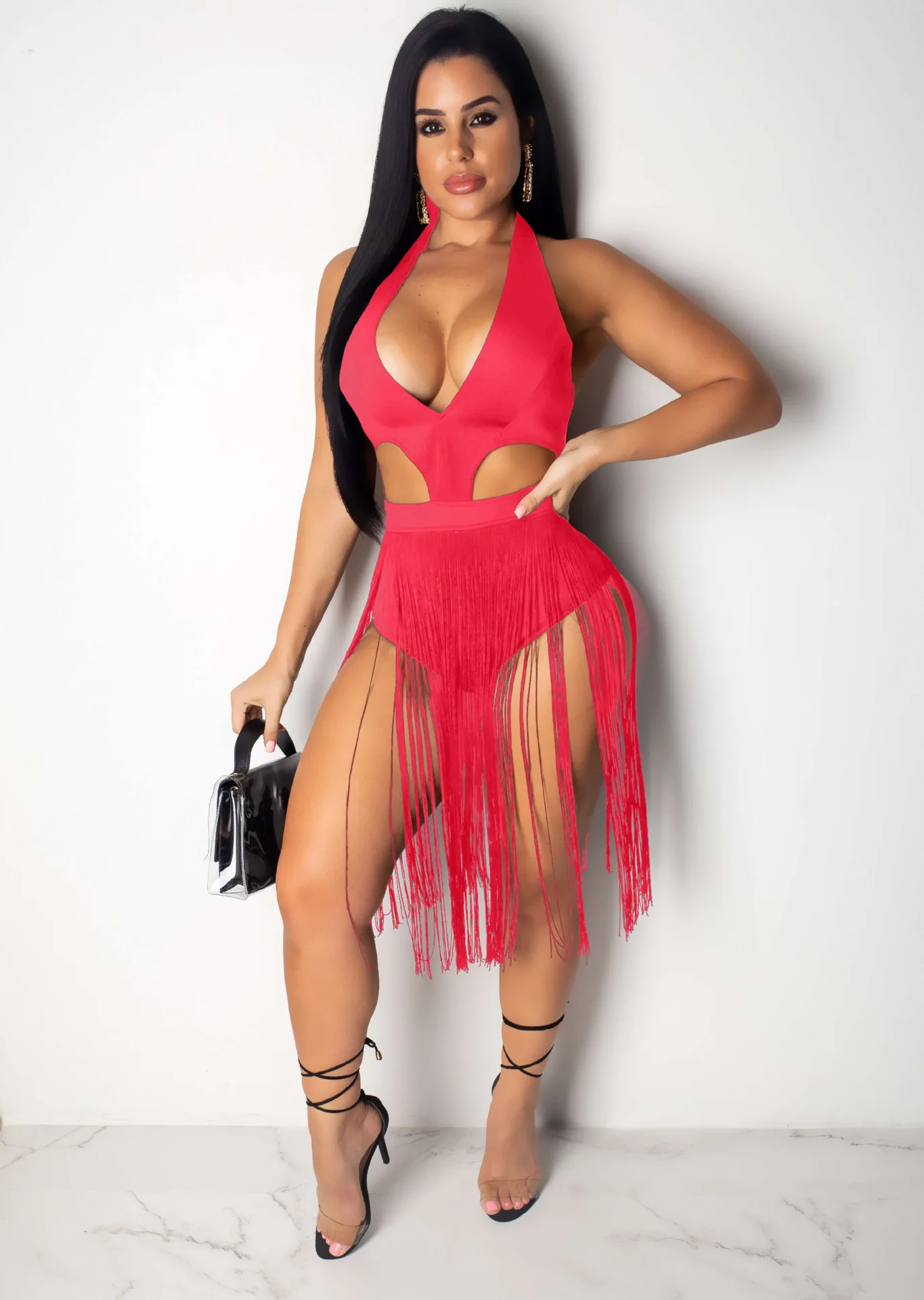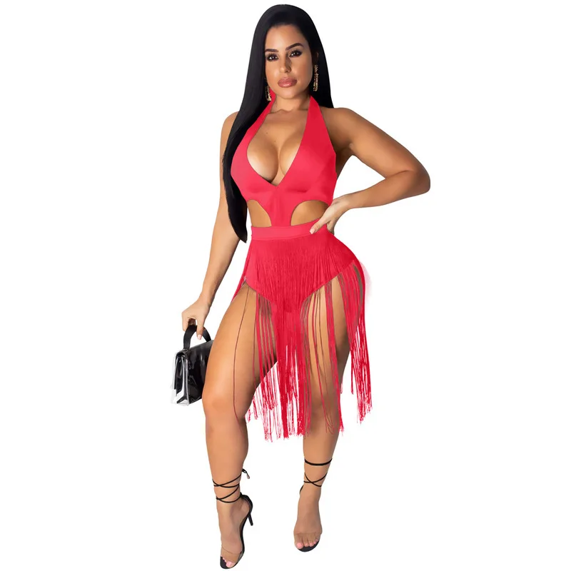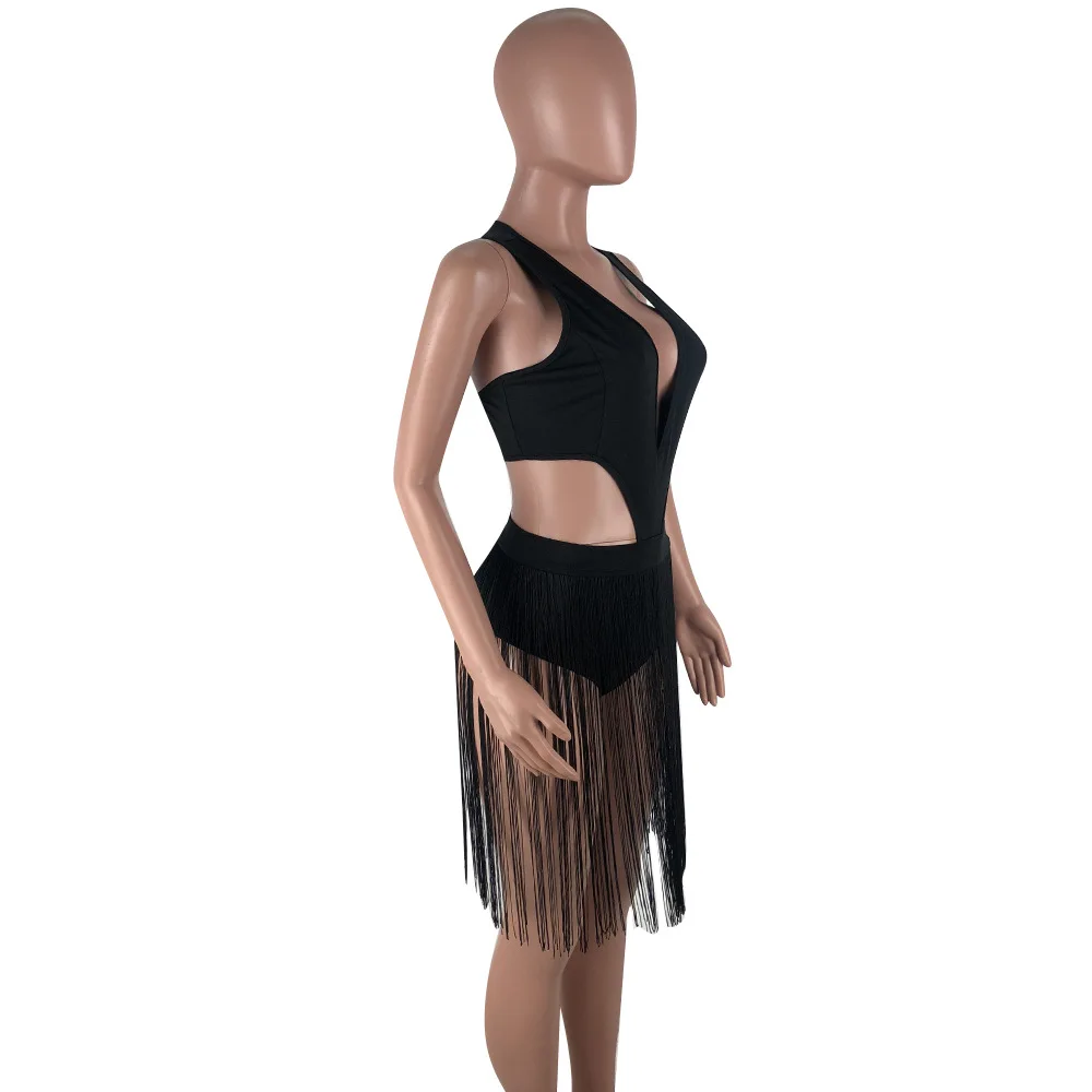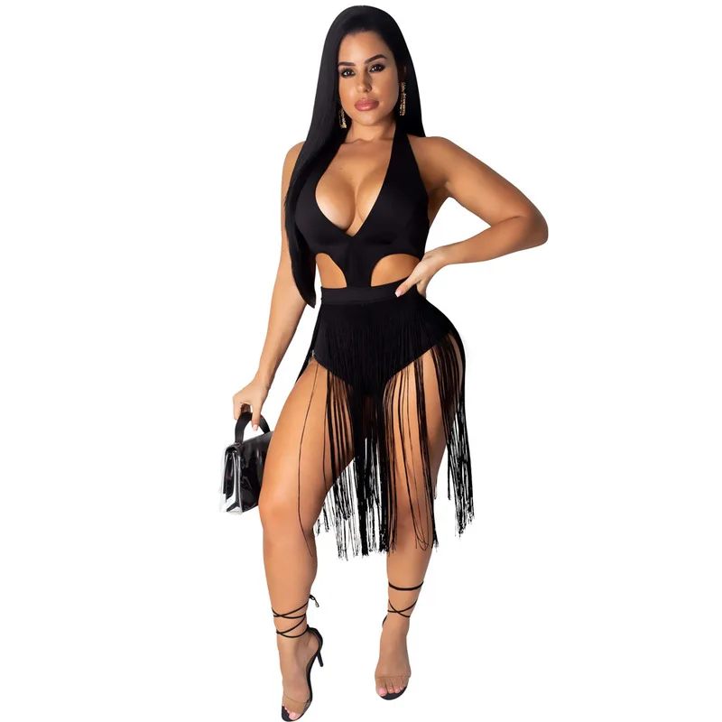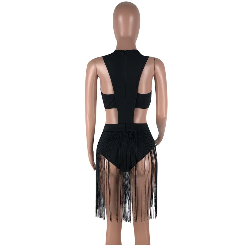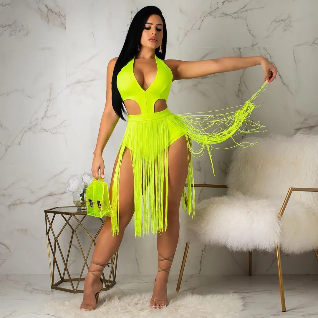 Waist Band Cut Out Tassels Sexy Beach Bodysuit Women Open Back Bandage Short Jumpsuit Summer V Neck Neon Green Bodycon Playsuit