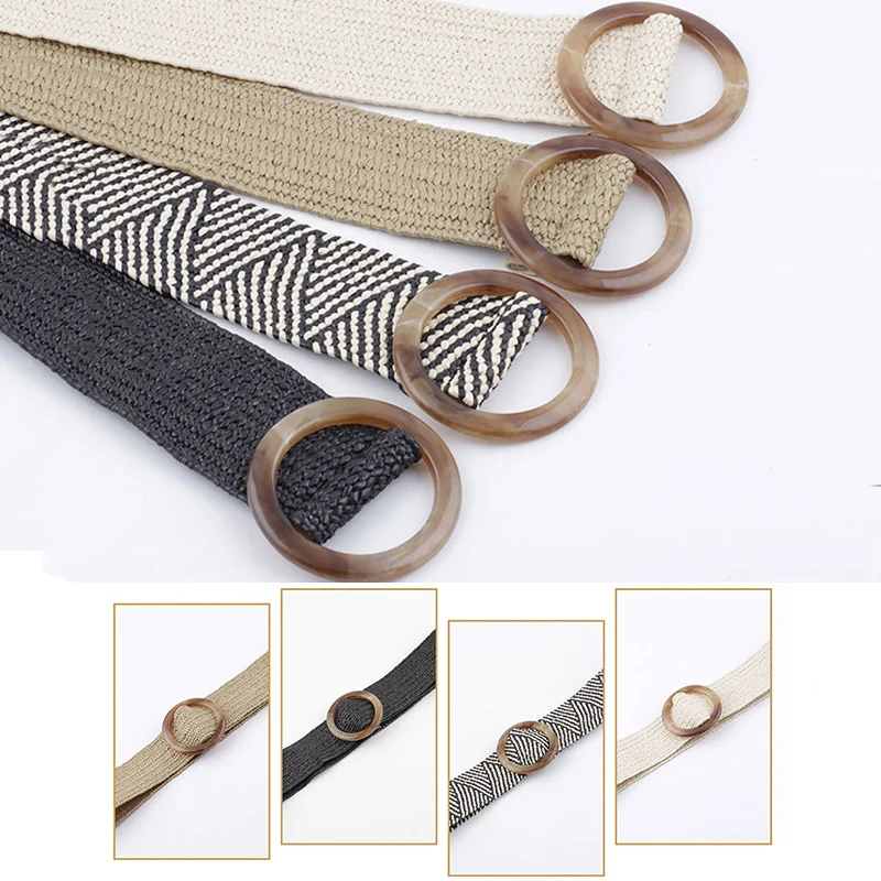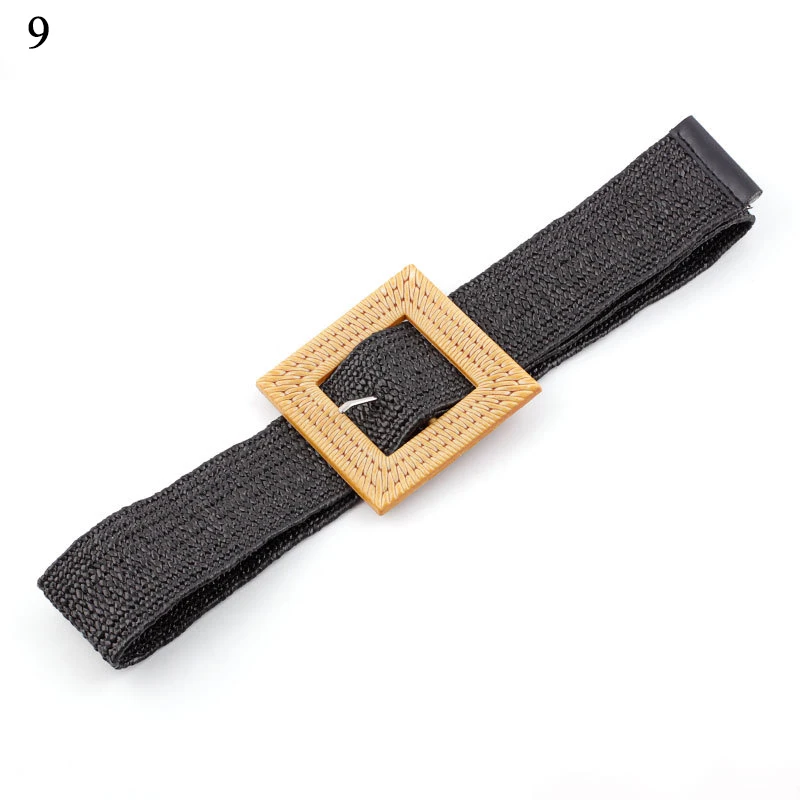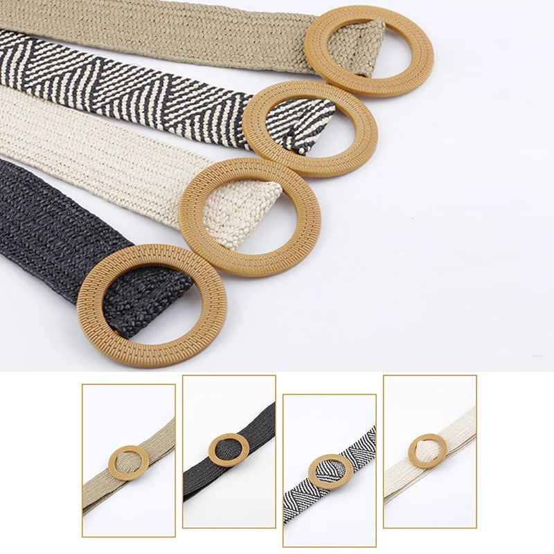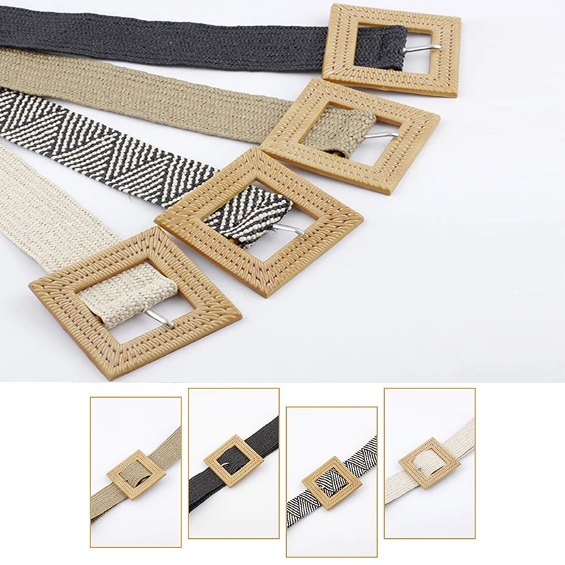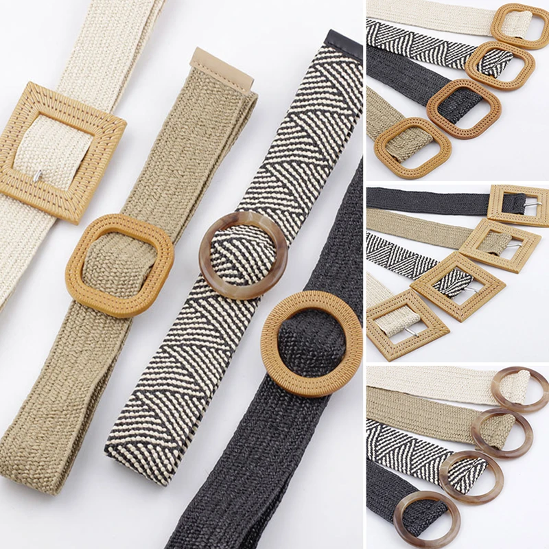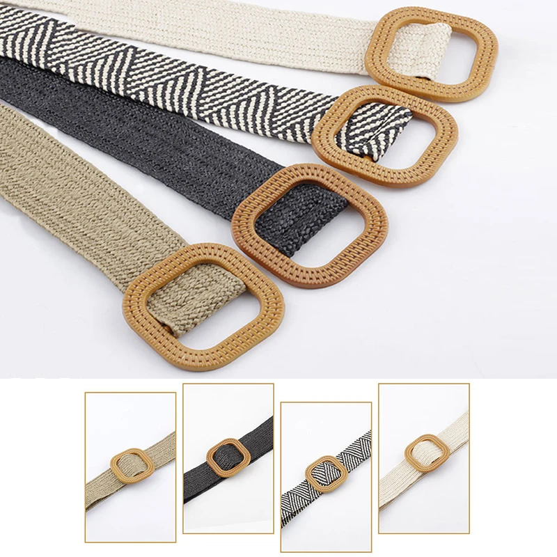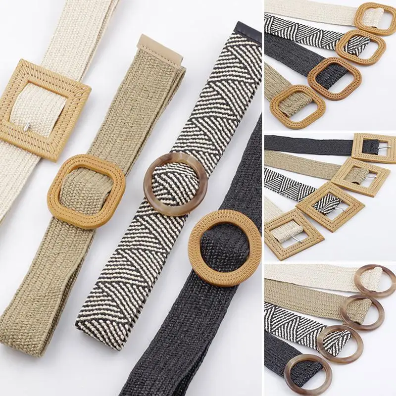 Boho Unisex Wide Straw Braided Woven Waist Belt Casual Round Square Buckle Belt