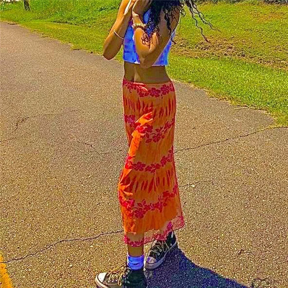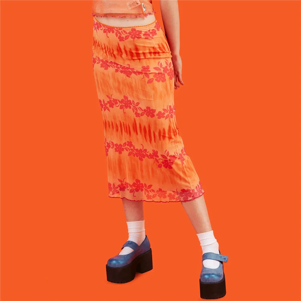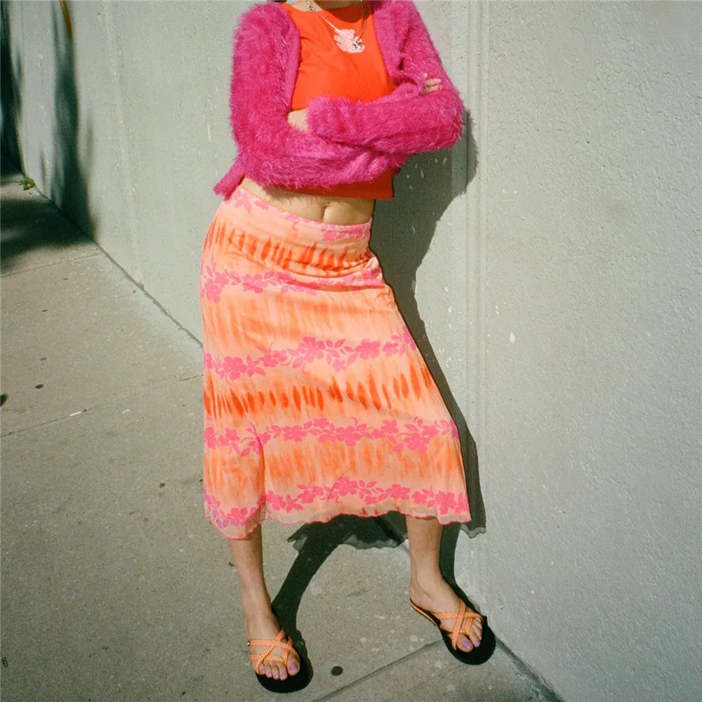 Women Fashion Sundress Floral Print Bright Colors Bohemian Style Casual Summer Holiday Beach Party Streetwear Orange Midi Skirt