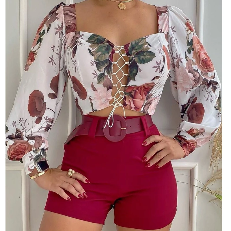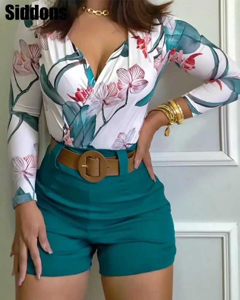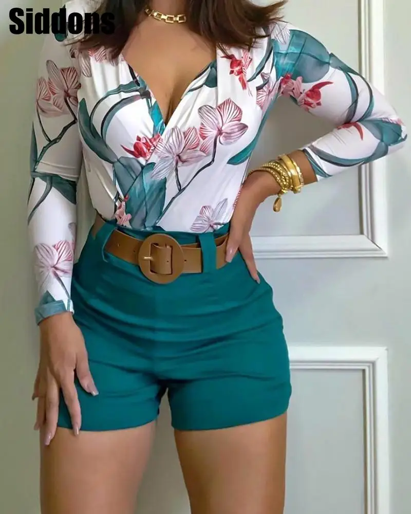 Women Floral Print Long Sleeve V Neck Top & Shorts Set Casual 2 Piece Set