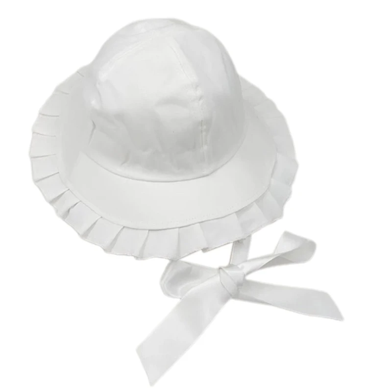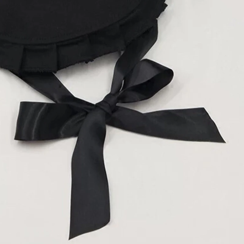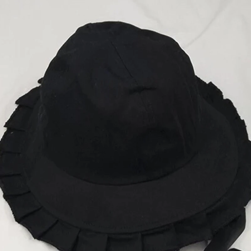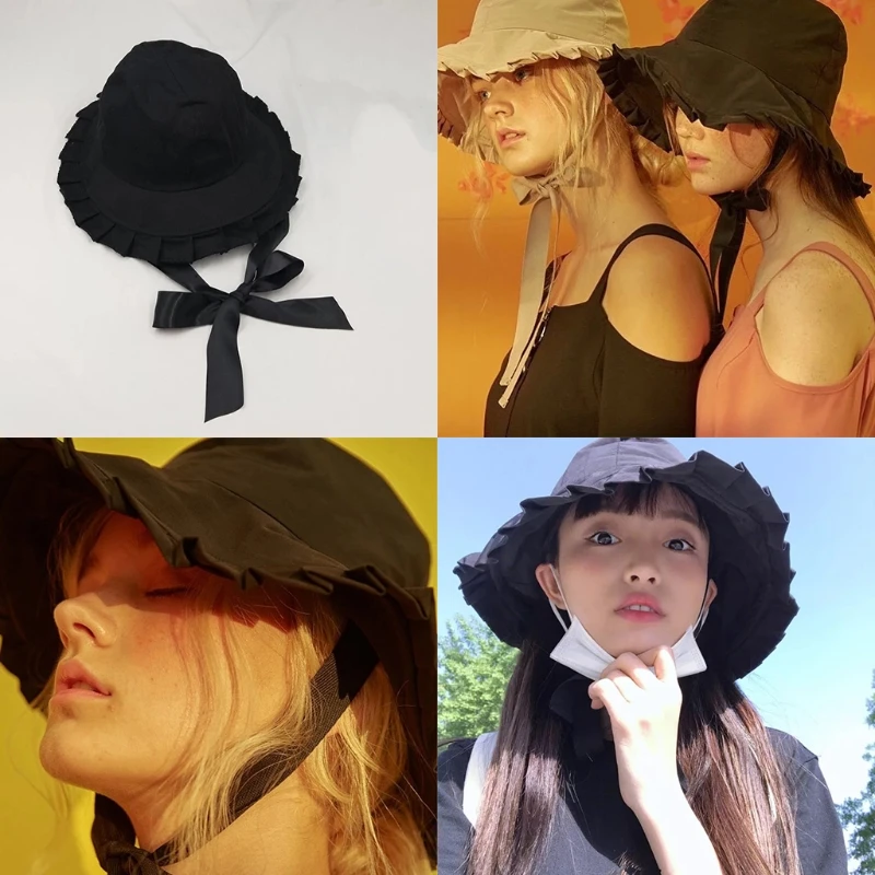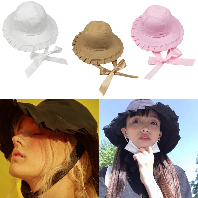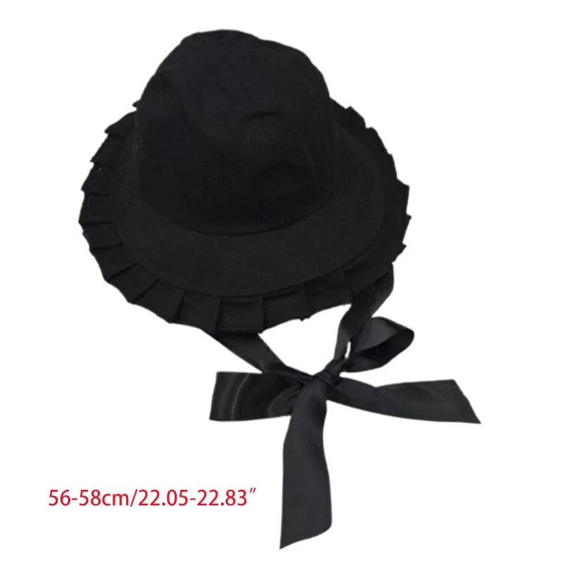 Women Girls Sweet Ruffles Wide Brim Bucket Hat with Satin Long Ribbon Japanese Lolita Bowknot Sunscreen Fisherman Cap