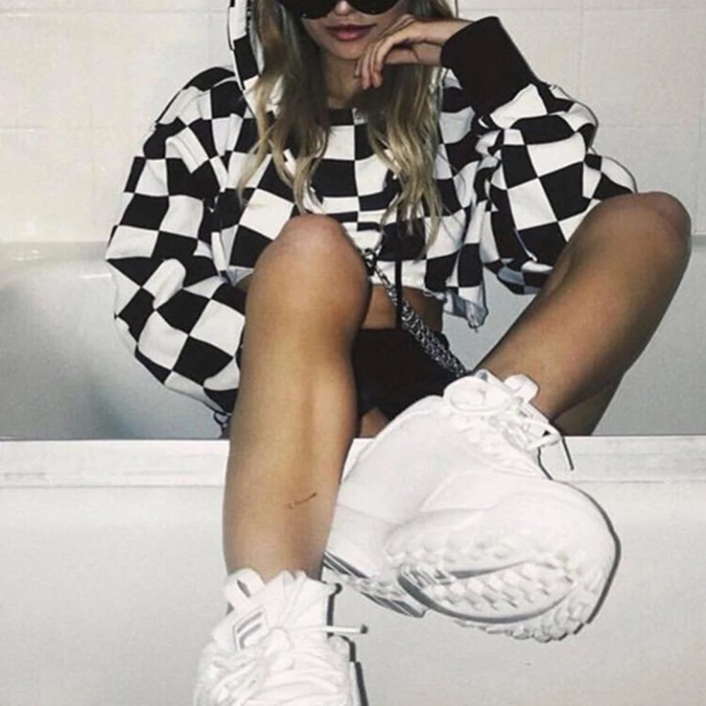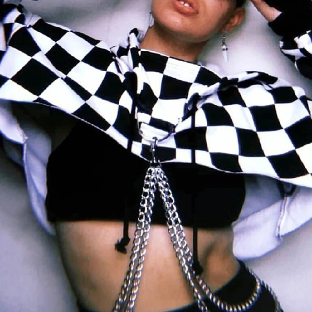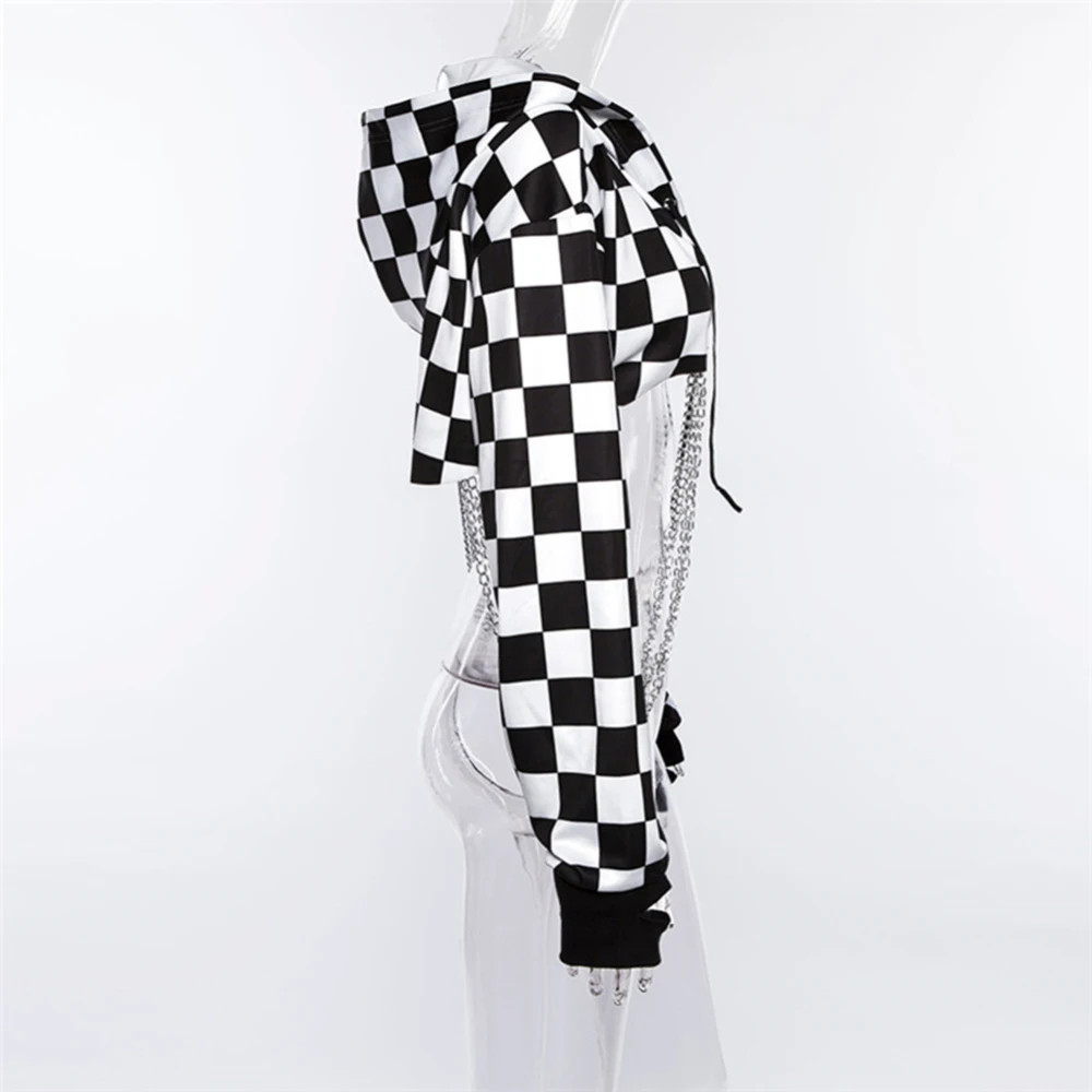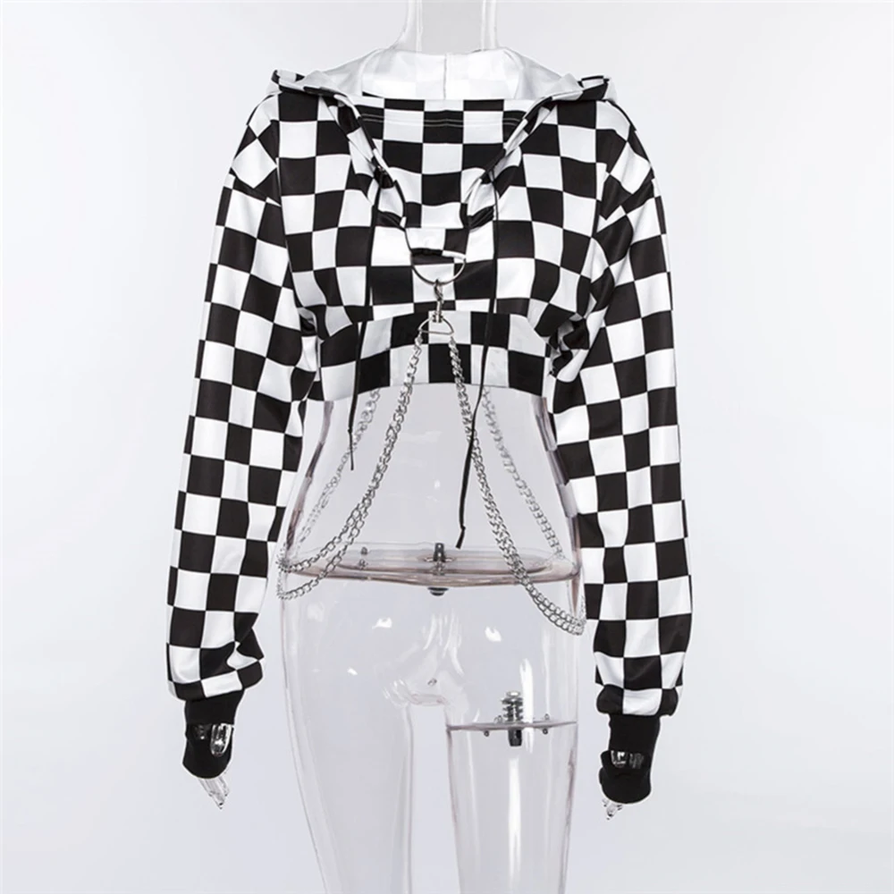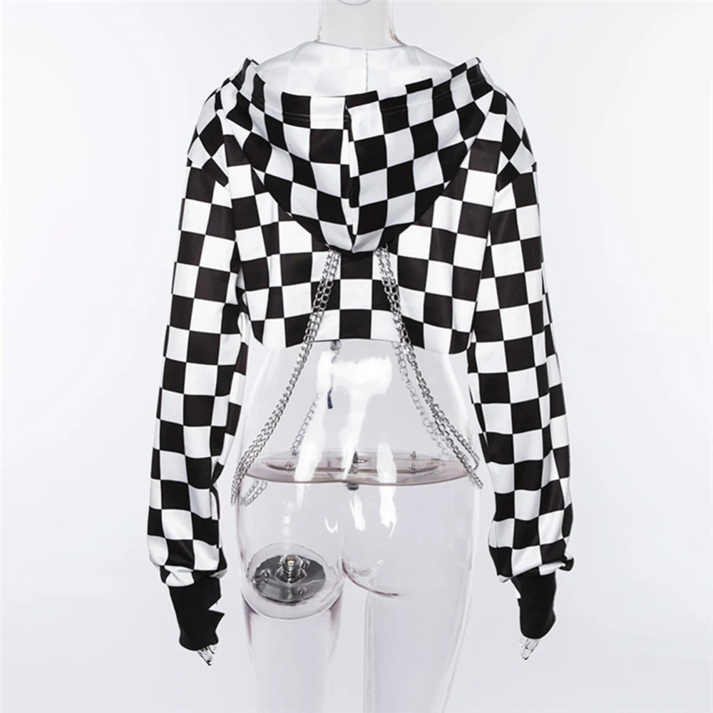 Women Plaid Casual Streetwear Sweatshirt Hoodie Crop Top Jumper Pullover Chain Stitching Short Loose Sweatshirt Plaid Shirt