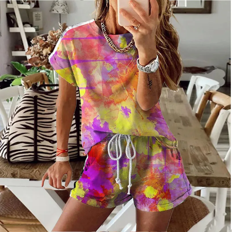Women Set Summer Tie Dye Short Sleeve Top Shirt Loose And Biker Shorts Casual Two Piece Set Streetwear Outfits Tracksuits