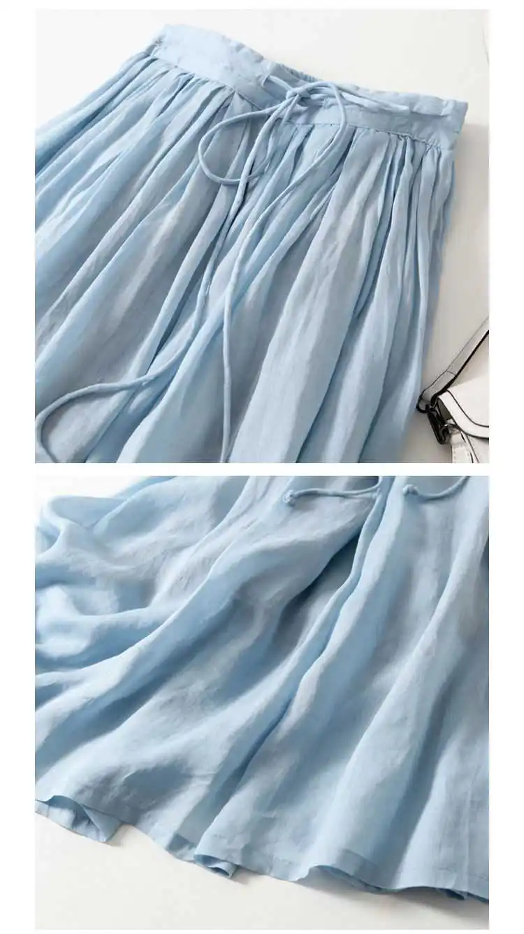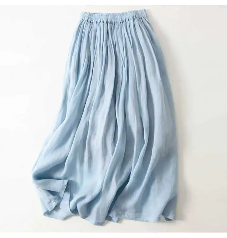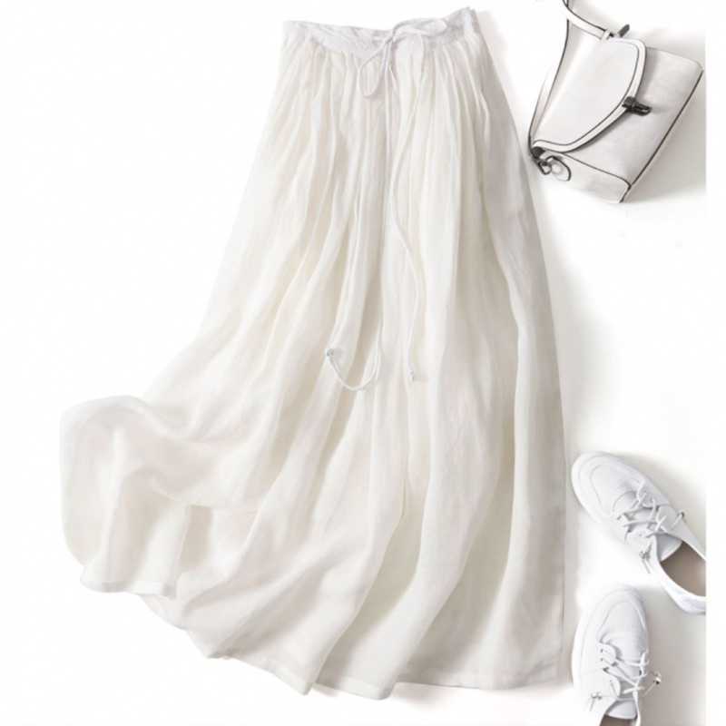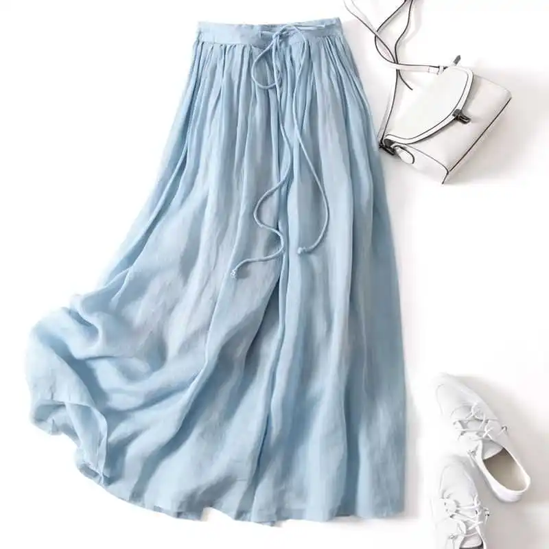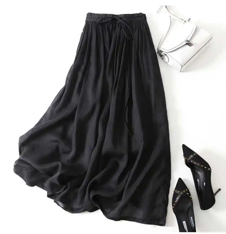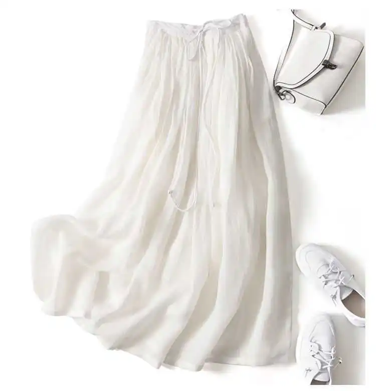 Women Solid Quality Skirt Summer Korean Style Elastic Waist Lace-Up Vintage Cotton Linen Office Ladies Maxi Long A-line Skirts