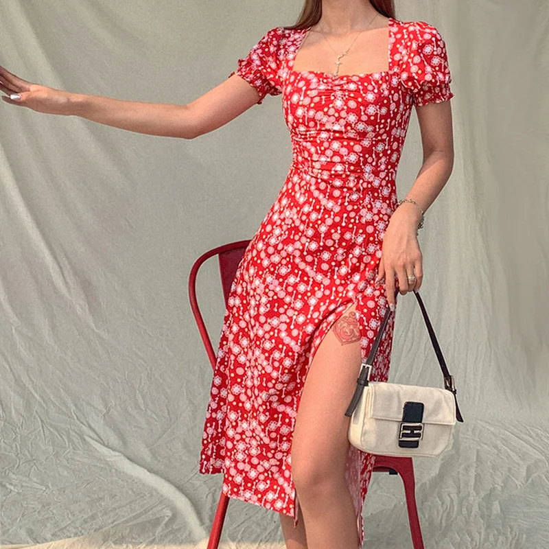 Women Summer Vintage Party Dress Lady France Style Puff Sleeve Floral Print Square Collar Side Split Midi Dress Vestido 2021