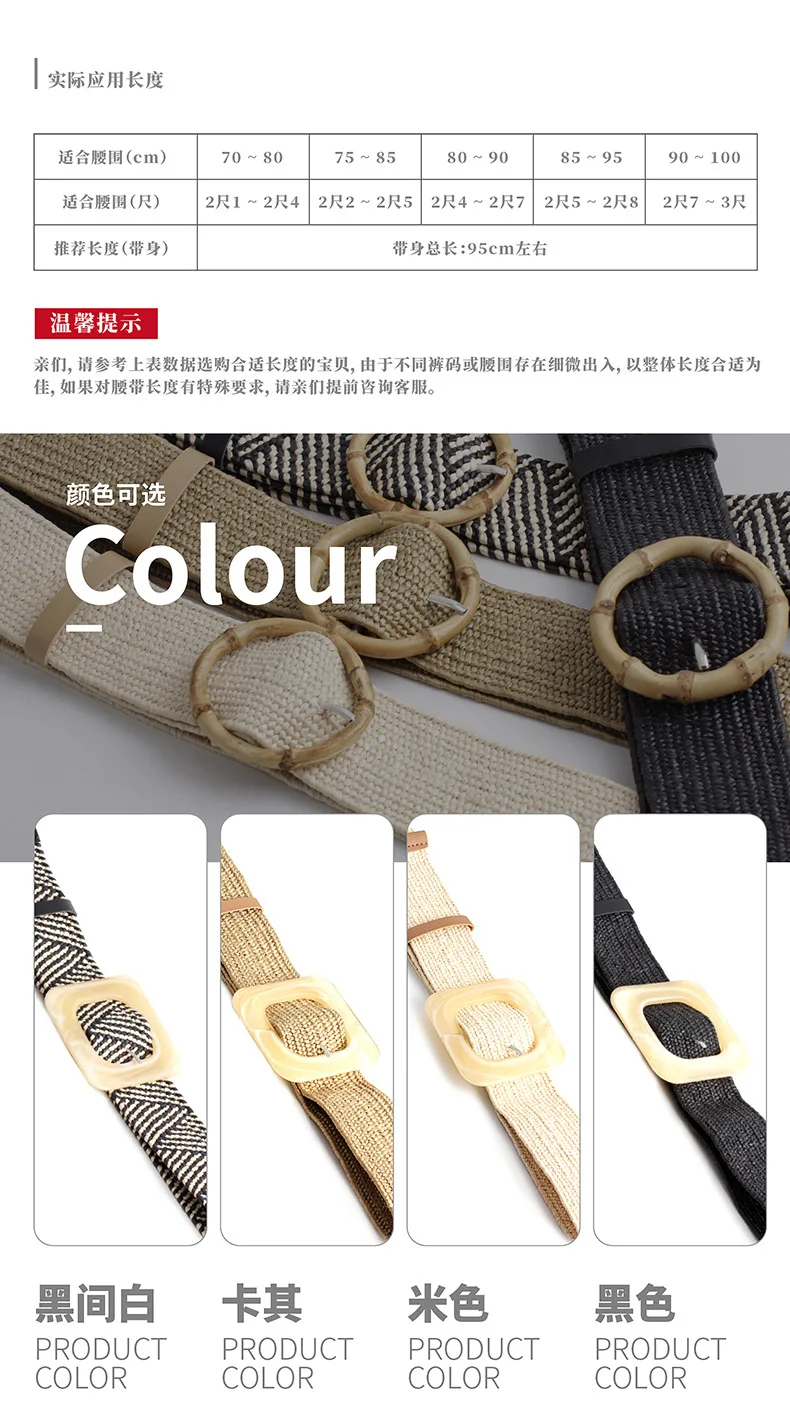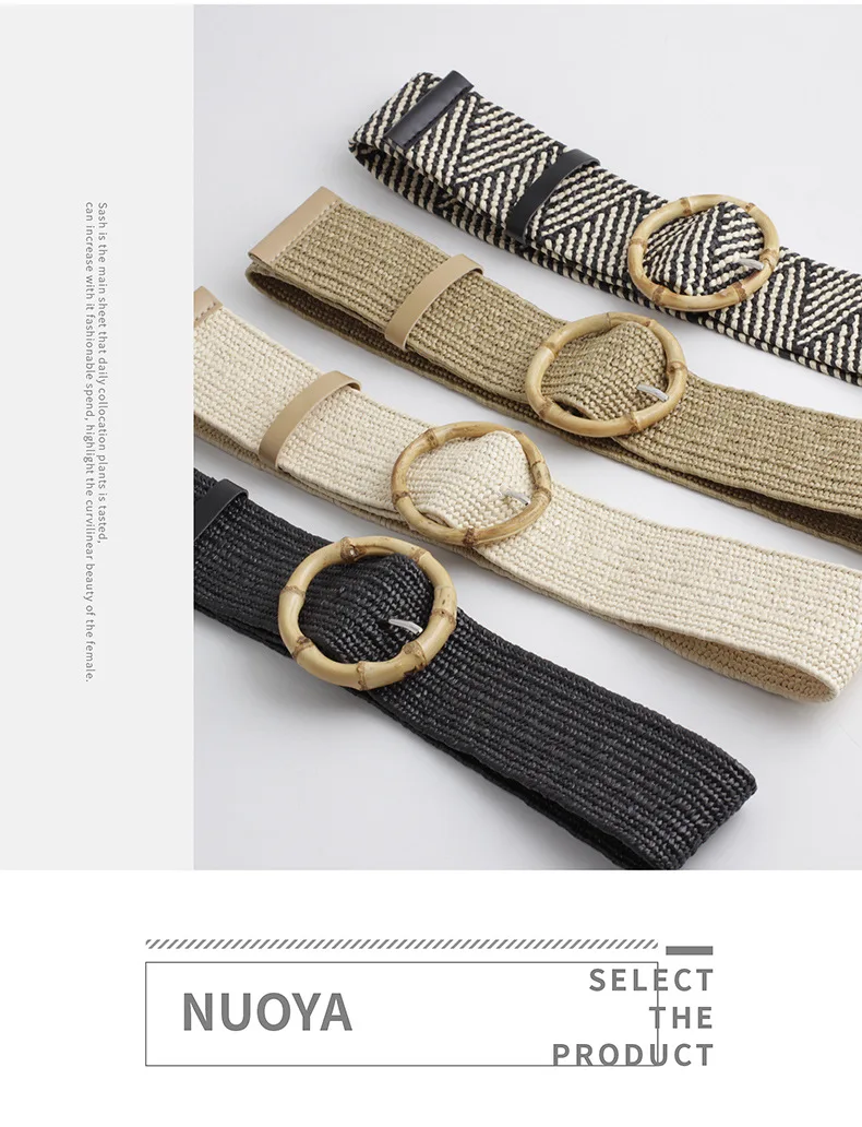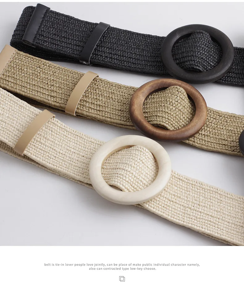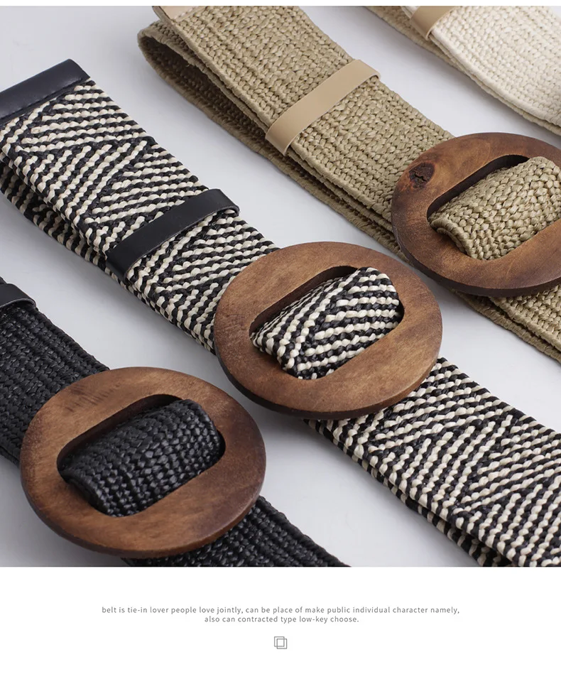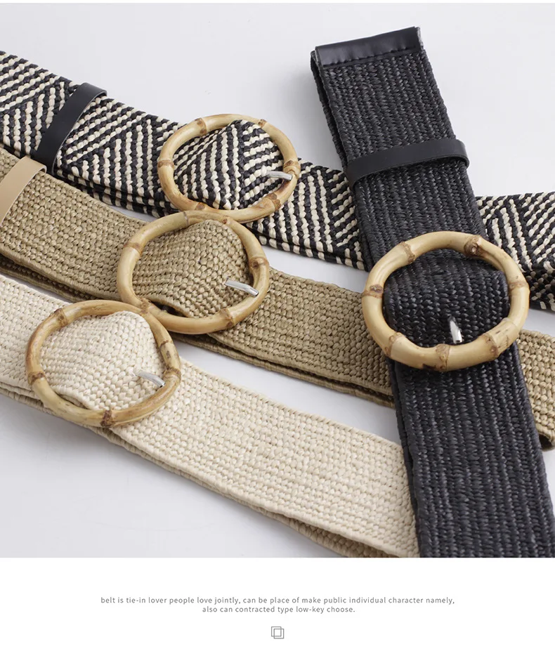 Women Wide Braided Elastic Belt for Dress Round Bamboo Buckle Casual Fashion Girdle Wood Jade Buckle Fake Straw Waistband