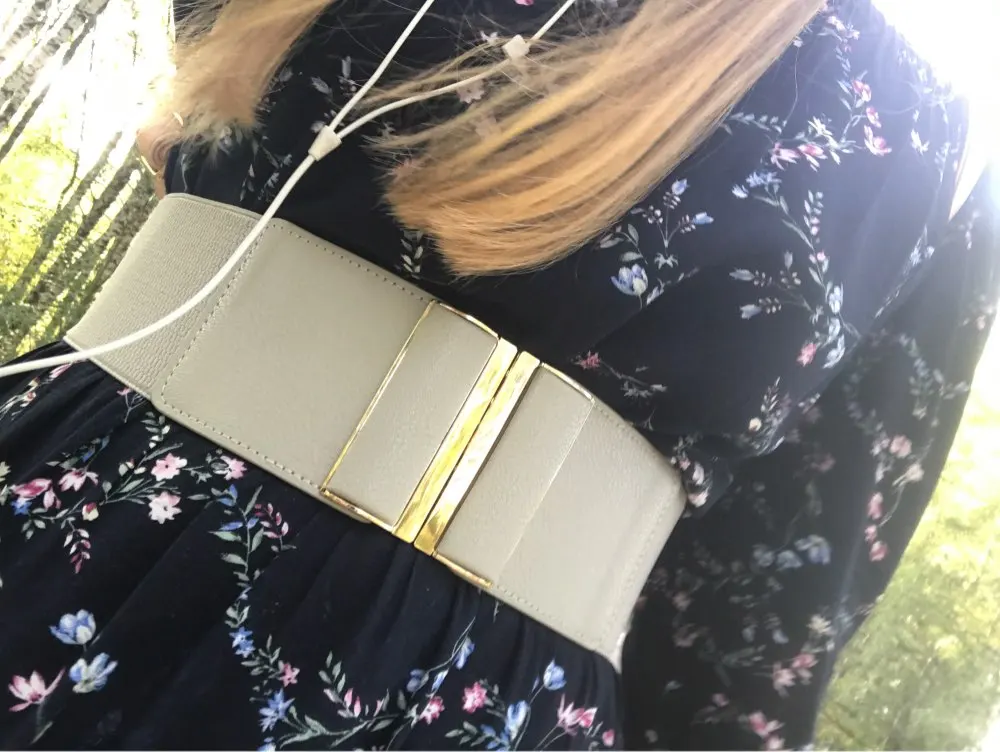 3 inch wide for the band good choice for girls and ladies for all season with dress, skirts, sweaters and down jacket to make you slim and charming