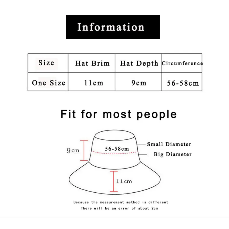 Size:Hat circumference 56-58cm, hat brim length 11cm, hat depth 9cm