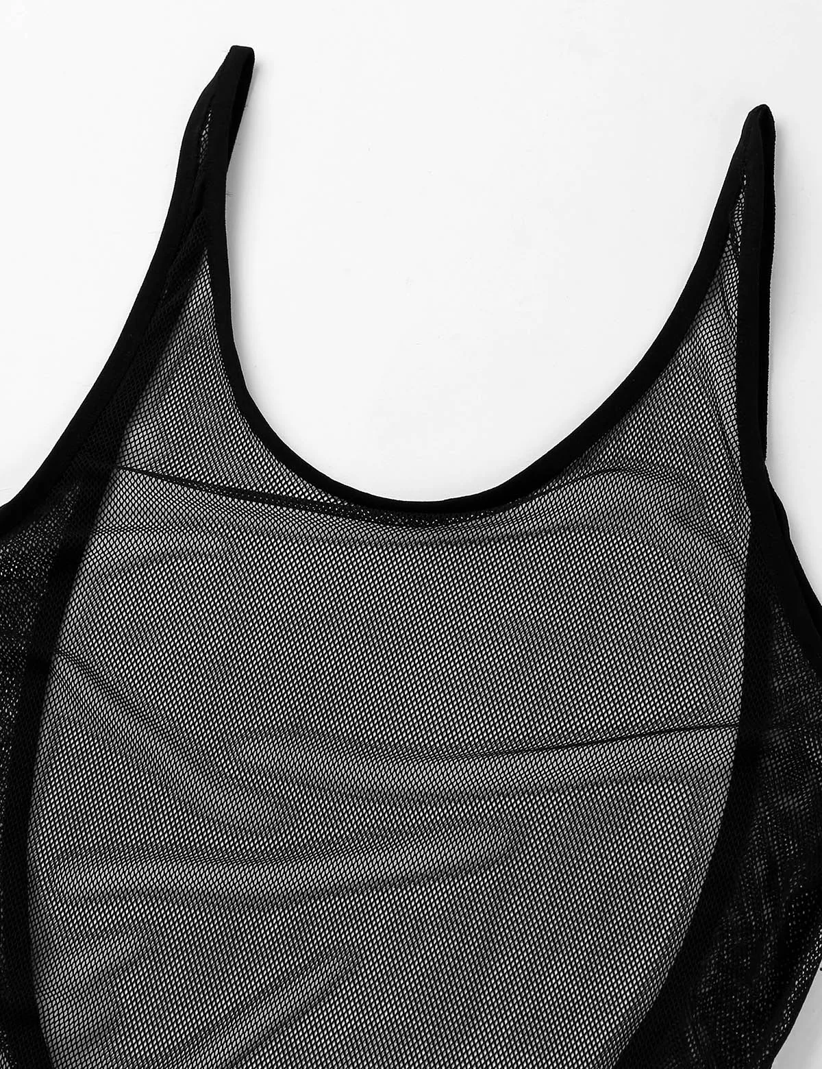 See through fishnet design, U-neckline and backless, high cut legs, pull on closure.