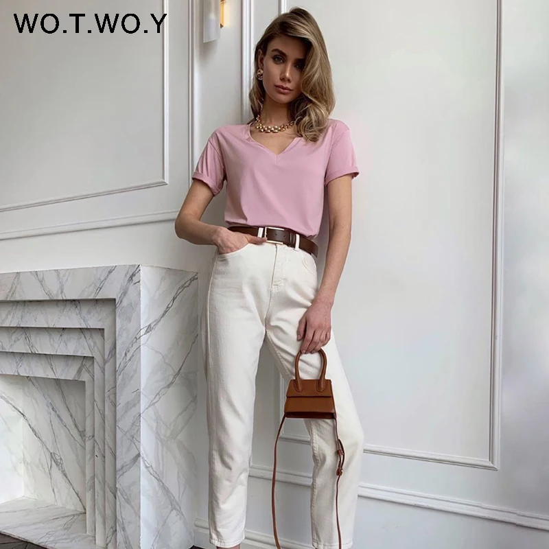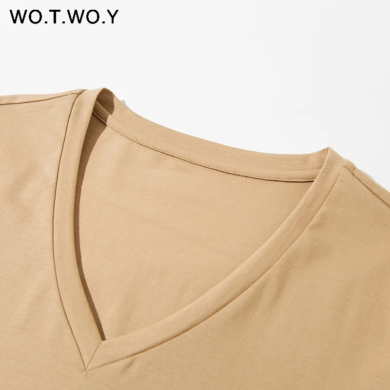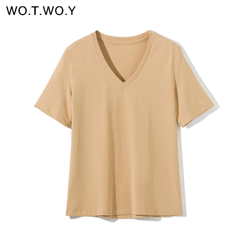 WOTWOY Summer Knitted V-Neck T-Shirt Women Cotton Basic Solid Tee Shirt Female Short Sleeve Kintwear Tops Harajuku Tshirt Ladies