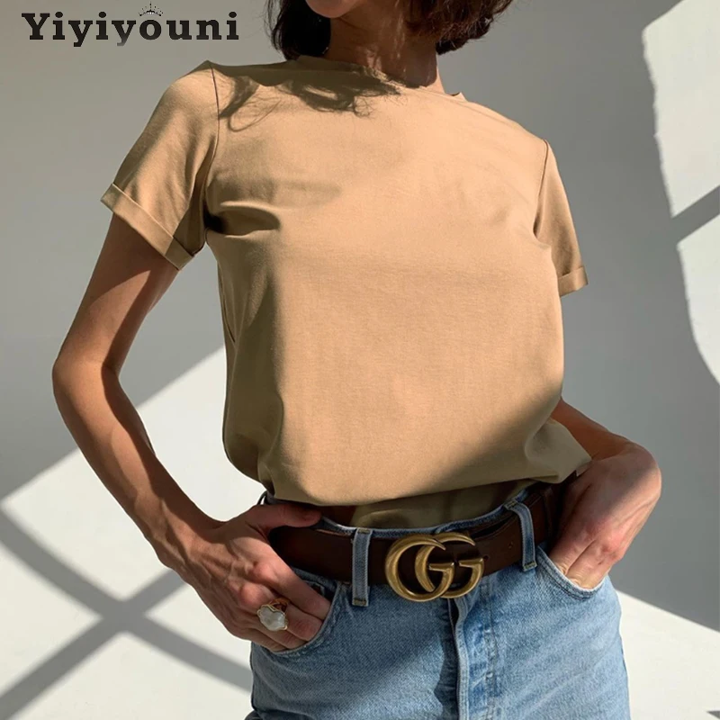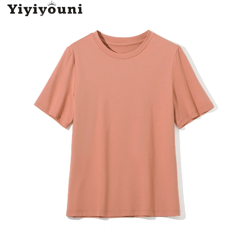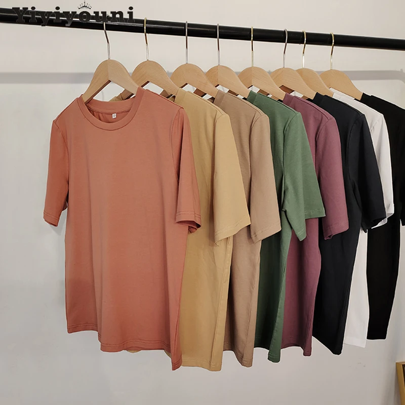 Yiyiyouni Solid Casual Basic T-shirt Women Summer Short Sleeve Cotton Tee-Shirt Women O-Neck Black White Korean Tops Female 2021