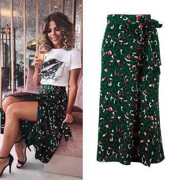 Vintage Leopard Print Long Skirts Women High Waist Midi Skirt Bow Tie 2021 Summer Sexy Split Wrap Skirt Ladies Green Beach