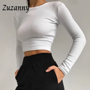 Zuzanny O Neck Long Sleeve Shirt Women Ribbed Sexy Cropped Tops 2021 Spring Black Casual Skinny Slim Basic Woman T Shirts White