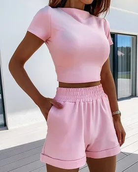 VS&LLWQ 2 Piece Set Women Summer O-Neck Casual Crop Top 2020 Female Clothing Tracksuit Pockets Loose Shorts Two Piece