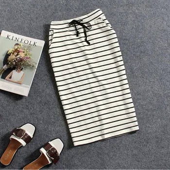 2021 Summer Pure Cotton Black And White Stripes Casual Pocket Mid-length Bag Hip Pencil One Step Half-length Skirt Ladies Skirt