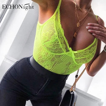 Echonight Lace Bodysuit Women Floral Embroidery Transparent Sexy Bodysuit Jumpsuit Bodycon Sleeveless Overalls Lace Romper