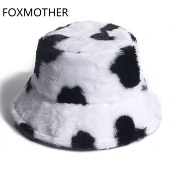 FOXMOTHER New Fashion Faux Fur Cow Print Bucket Hats Women Winter Panama Fisherman Caps Gorra