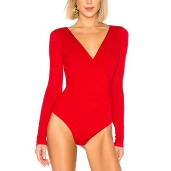 Magiray Women Bodysuit Thong Surplice Ruched Deep-V Neck Long Sleeve Tops 2020 Sexy Jumpsuits White Red Black Summer Body Suits