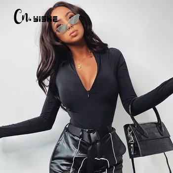 CNYISHE Overalls Zipper Long Sleeve Bodycon Bodysuit For Woman Pure Winter Rompers Women Jumpsuits Sexy Body Female Black Tops