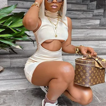 WJFZQM Sexy Bodycon Black Dress Women Summer Khaki Short Pencil Dress Party Club Hollow Out Ribbed Sleeveless Mini Wrap Dresses