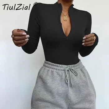 TiulZial Pure Zipper Bodycon Bodysuit For Woman Black Autumn Sexy Bodysuit Women Winter Basic Body Female White Top Romper