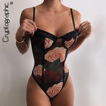 Cryptographic Fashion Floral Mesh Sheer Straps Bodysuits See Through Club Party Sexy Backless Bodysuit Teddy Bodycon One Piece