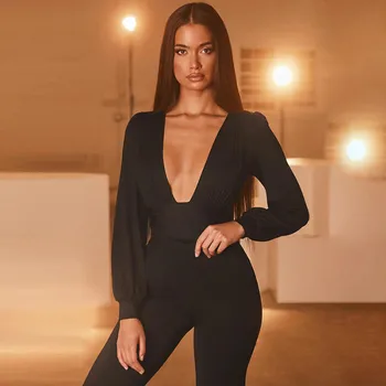 2020 Autumn Winter Rompers Women Jumpsuits Sexy Club V Neck High Waist Solid Bodycon Regular Long Sleeve Female Bodysuits Women