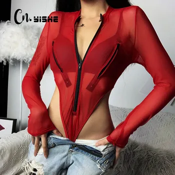 CNYISHE Sexy Club Bodysuits Women Tops Streetwear Red Mesh High Waist Bodysuit Romper Female Body Basic Summer Outfits Swimsuit