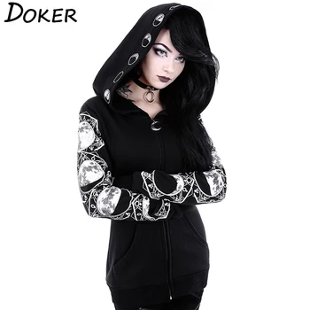Women Hoodies Gothic Punk Moon Letter Print Sweatshirts 2020 Autumn Winter Long Sleeve Black Jacket Zipper Coat Casual Hoody 5XL