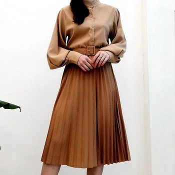 High Waist Women Skirt Casual Vintage Solid Belted Pleated Midi Skirts Lady 19 Colors Fashion Simple Saia Mujer Faldas