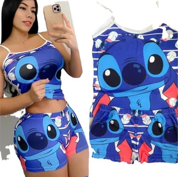 Disney Stitch women clothing 2021Summer new women pink vest casual sexy cute cartoon printed shorts mickey women shorts suit