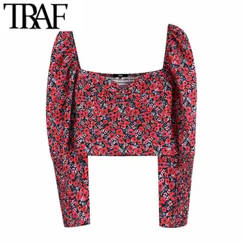 TRAF Women Vintage Stylish Floral Print Short Style Blouses Fashion V Neck Long Sleeve Back Elastic Female Shirts Chic Crop Top