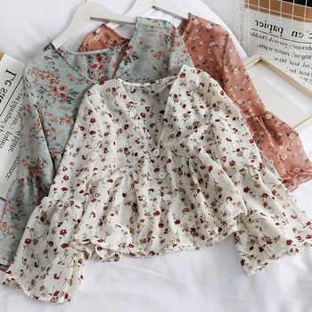 Women’s V Neck Fashion Floral Print Chiffon Blouses Sweet Small Fresh Long Sleeves Chiffon Shirt Blouses