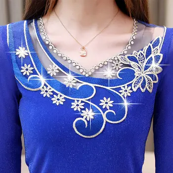 2020 Autumn Winter Women Lace Embroidery Mesh Stitch Blouses Lady Bottoming Shirt Long-sleeved Bright Silk Ruffle Tops Plus 4XL