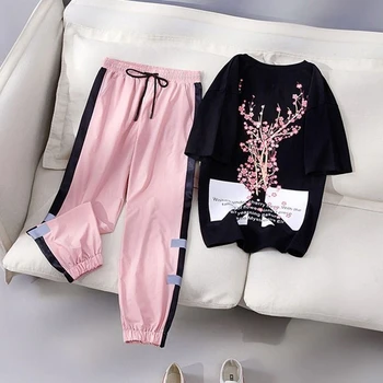 Two Piece Set Women Fashion Sport casual suit Flower Letter Print Top+Print Elastic Waist Long Pants Summer Tracksuit Female T15