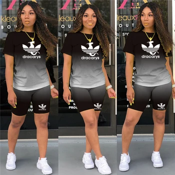 Two Pieces Sets Women Tracksuits Gradient Short Sleeve Tops + Jogger Shorts Leggings Suit Sporty Fitness Outfit 2021 Summer
