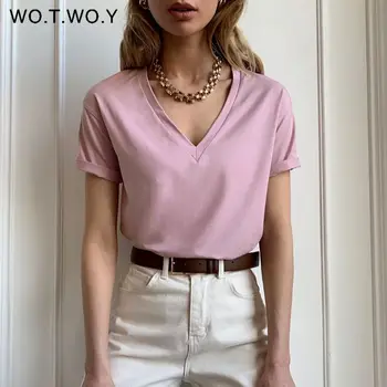 WOTWOY Summer Knitted V-Neck T-Shirt Women Cotton Basic Solid Tee Shirt Female Short Sleeve Kintwear Tops Harajuku Tshirt Ladies