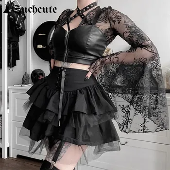 SUCHCUTE Goth Aesthetic Lace Up Mini Skirt For Women Dark Academia Mesh Patchwork A-Line Skirt Punk Style Party Black Saias