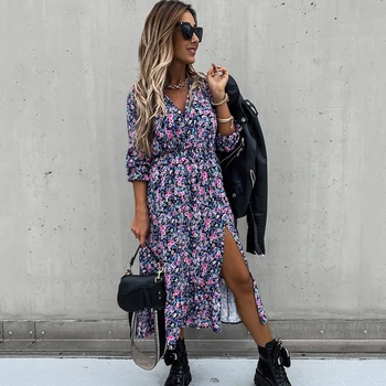 Autumn Winter Long Floral Print Dress Robe for Women 2021 Casual Long Sleeve Split Dress Female Boho Elegant Maxi Party Vestidos