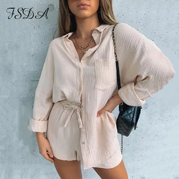 FSDA 2021 Summer Autumn Long Sleeve Top Shirt Women And Shorts Casual Women Set Black Two Pieces Set Loose Outfit Female