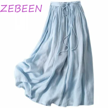 Women Solid Quality Skirt Summer Korean Style Elastic Waist Lace-Up Vintage Cotton Linen Office Ladies Maxi Long A-line Skirts