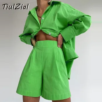 TiulZial Casual Women Short Set Tracksuit Loungewear Two Piece Women Outfits Oversized Long Shirt And High Waist Shorts Green