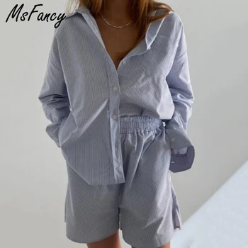 Msfancy Summer Short Sets Women 2021 Long Sleeve Shirt Pajamas Blue Striped High Waist Shorts Mujer Two Piece Set